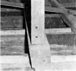 Die in der Deckenbalkenkonstruktion bis zu den Quadratseiten laufenden Balken 7 und 8 sind im Quadratinnern nachträglich ergänzt worden (Abb. 18). Es handelt sich hierbei um Nadelholz oh n e Bemalung im Gegensatz zur gefaßten Eiche des alten Balkenwerks (Abb. 19). Hieraus sowie aus der Tatsache, daß die Bohlenlage des Quadratinnern ebenfalls u n bemalt war, läßt sich mit Sicherheit folgender Schluß leiten: Ursprünglich war innerhalb des Balkenquadrates ein Deckenabschluß n i c h t vorhanden. Die Tatsache, daß auch die Dachstuhlkonstruktion auf der Basis dieses Quadrates nach oben in den Gesamt-Dachstuhl bis kurz unterhalb Firsthöhe hineinführend, aufgerichtet ist (Abb. 20), läßt schon daraus die Vermutung zu, daß hier der Platz eines zweiten Turmes gewesen sein muß. Eines zweiten Turmes, der mit Sicherheit einmal dagewesen ist, der u.a. im Kirchenbuch unter den Ausgaben des Jahres 1578 Erwähnung mit der Eintragung findet